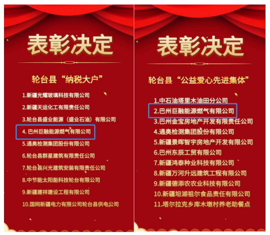 巴州巨融能源作為輪臺(tái)縣先進(jìn)單位,全年守法經(jīng)營(yíng)、安全合規(guī)、創(chuàng)業(yè)創(chuàng)新、回報(bào)社會(huì)。2022年度參與助民工程、解決當(dāng)?shù)剞r(nóng)副產(chǎn)品滯銷等公益活動(dòng)累計(jì)捐贈(zèng)超過10萬元,榮獲2022年度輪臺(tái)縣“納稅大戶”及“公益愛心先進(jìn)集體”榮譽(yù)稱號(hào)。